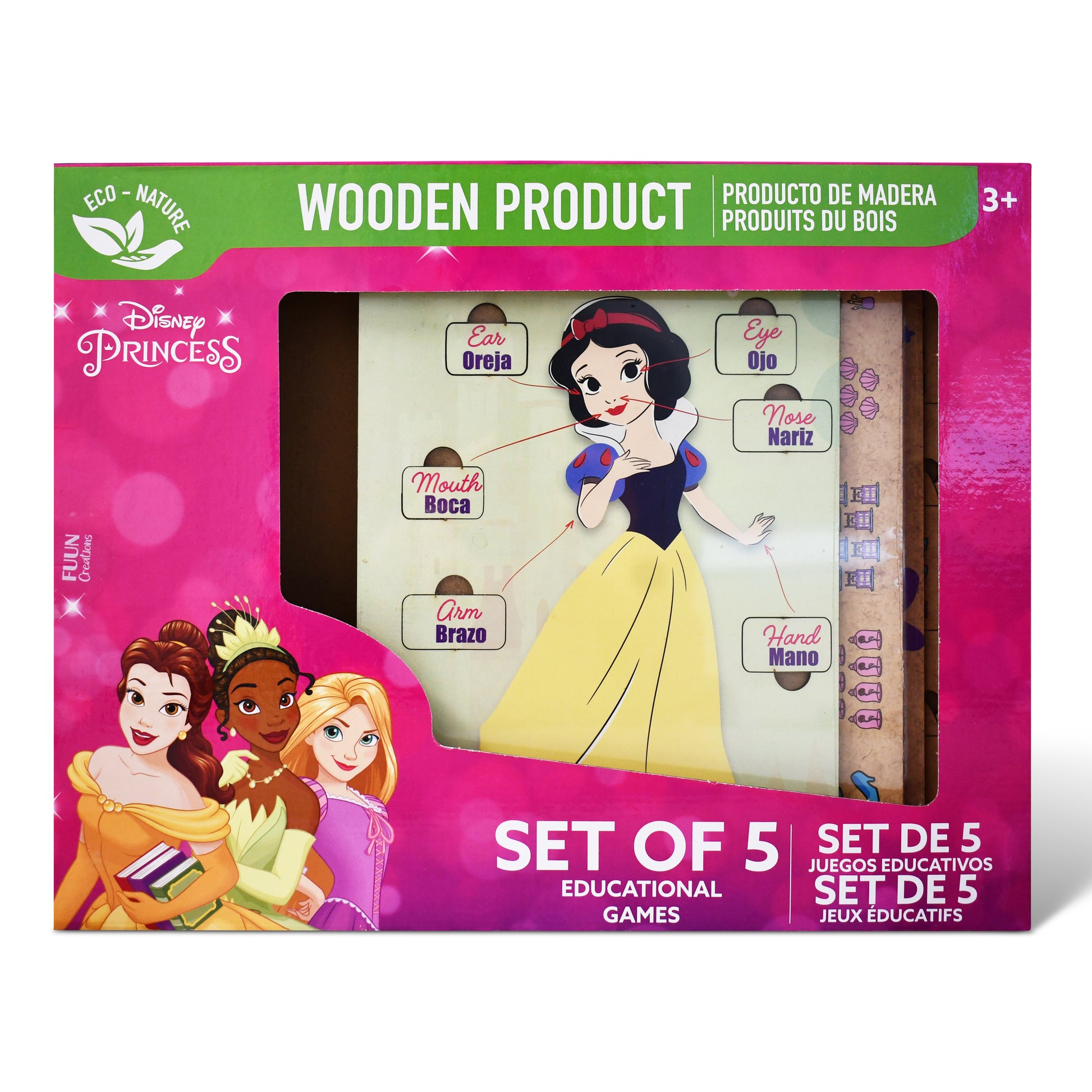 Invite a royal tutoring session with Belle, Tiana, Rapunzel and Snow White as guides through a world of wooden puzzles. Little hands slot shimmering princess-themed shapes into matching cut-outs, then point out and name facial features in English and Spanish on a graceful Snow White figure. Every letter of the alphabet comes alive as children trace each jewel-topped character, while counting from one to ten is rewarded with tiny tiaras and tells of first addition and subtraction adventures. Crafted from sustainable wood and printed in non-toxic inks, this enchanting set weaves storytelling with skill-building play that fosters fine motor control, bilingual vocabulary, number sense and problem-solving confidence fit for a princess.